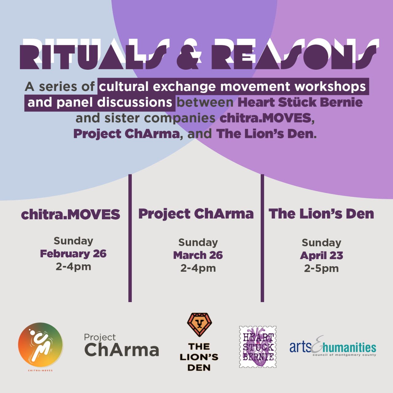 To engage more deeply with our DMV dance community, to better understand with whom and for whom we create, HSB will be participating in a Winter/Spring cross training series with three sister companies: Chitra.MOVES, Project ChARma, and The Lion’s Den.