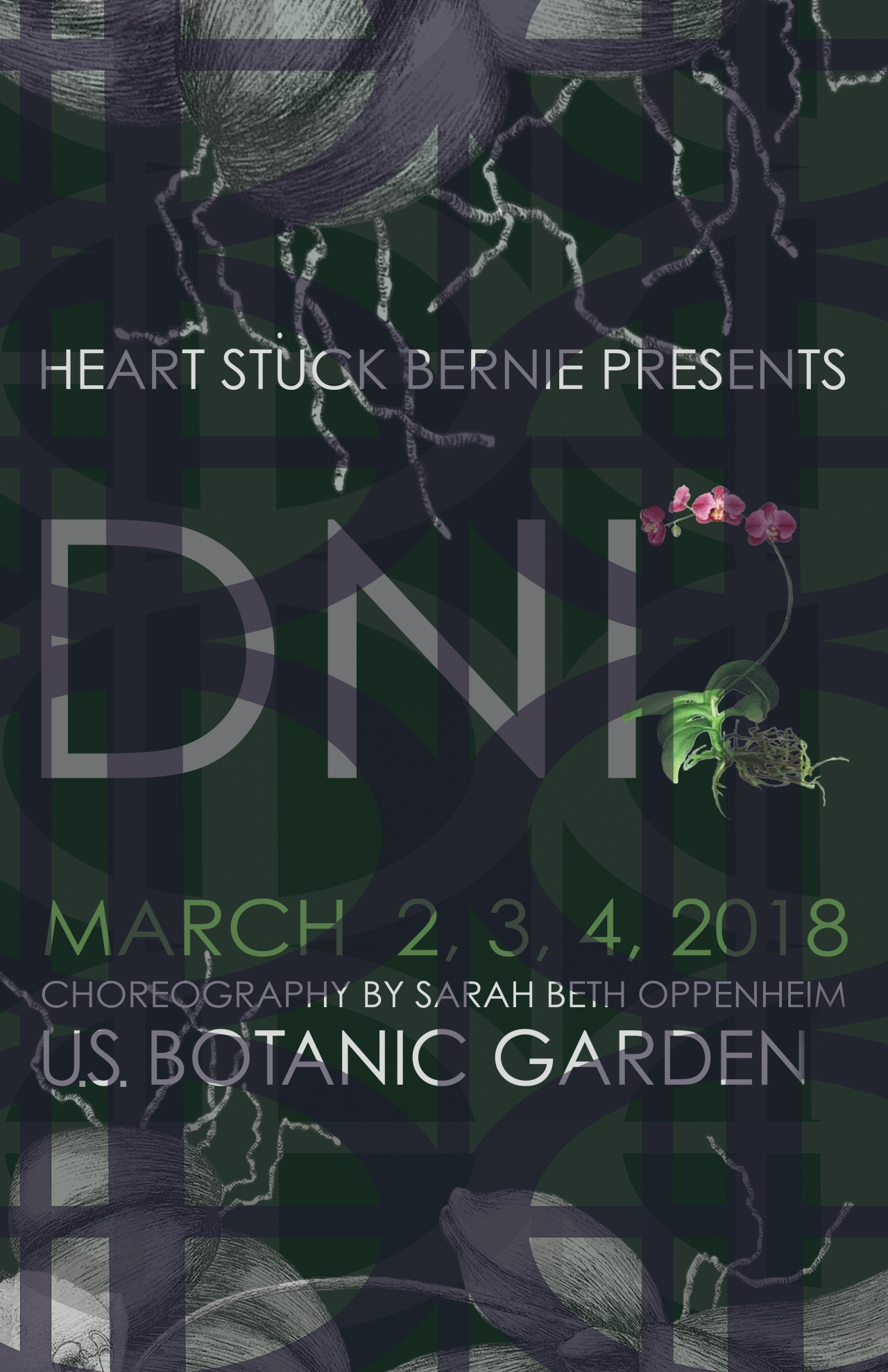 Heart Stück Bernie presents a new work staged alongside the tropics and cold-hearted flora of USBG’s annual orchid show. Known for her quirky-lush movement, Oppenheim’s artistic sensibilities are a perfect fit for genus orchidaceae: both traffic in tenacity and supreme attention to detail. Here Oppenheim and her phylum of Dancers consider how natural decline and employed deceit intersect with perfumed allure. Please join us for an evening of dance, drink, and flora, sure to regale green thumbs and thirsty roots. Stern, unsolicited advice about orchids: Do Not Ice.